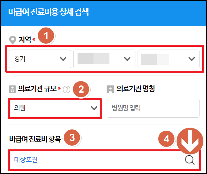 - 거주지와 의료기관 규모를 선택해 주세요. (사진 1 참조)
