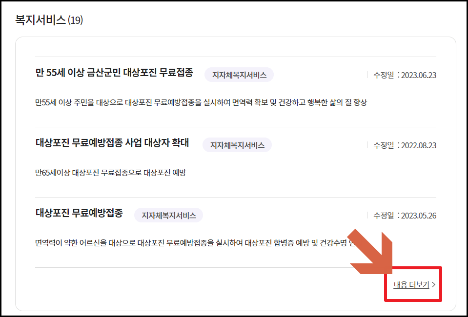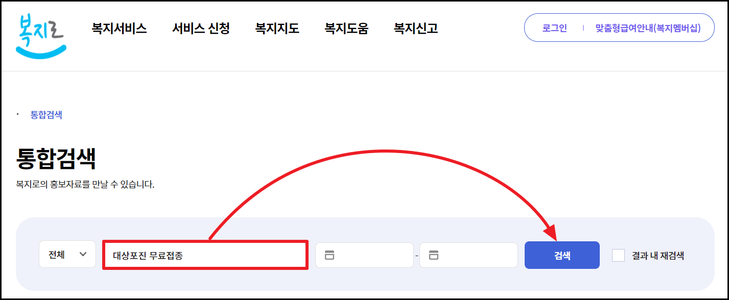 대상포진 무료접종 대상자인지 확인하시는 방법은 아래 바로가기 버튼을 클릭하시면 됩니다. 복지로 사이트에 접속하셔서 대상포진 무료접종이라고 입력 후 검색을 누르세요. 그 후 거주하시는 지역의 무료접종 대상자에 해당이 되는지 확인하시면 됩니다.