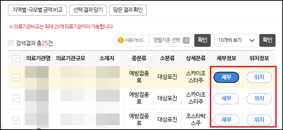 - 검색으로 나온 의료기관들 오른쪽에 보이는 세부정보를 누르시면 대상포진 예방접종 백신 가격이 나옵니다. (사진 4, 5 참조)