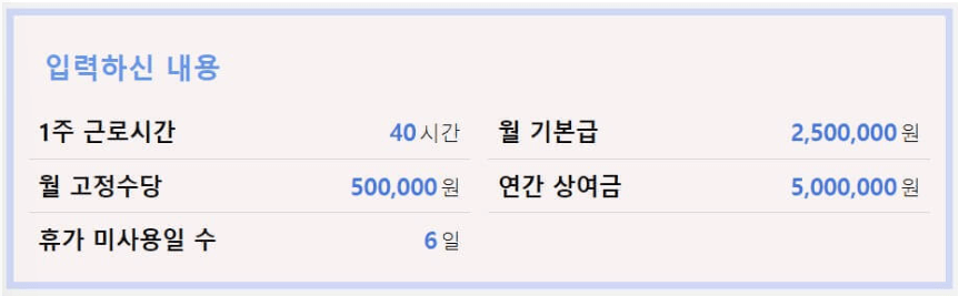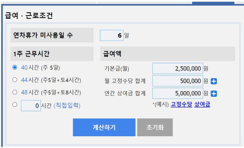연차휴가 미사용일 수 입력 ▶ 1주 근무시간 선택 ▶ 급여액 입력 ▶ 계산하기 클릭