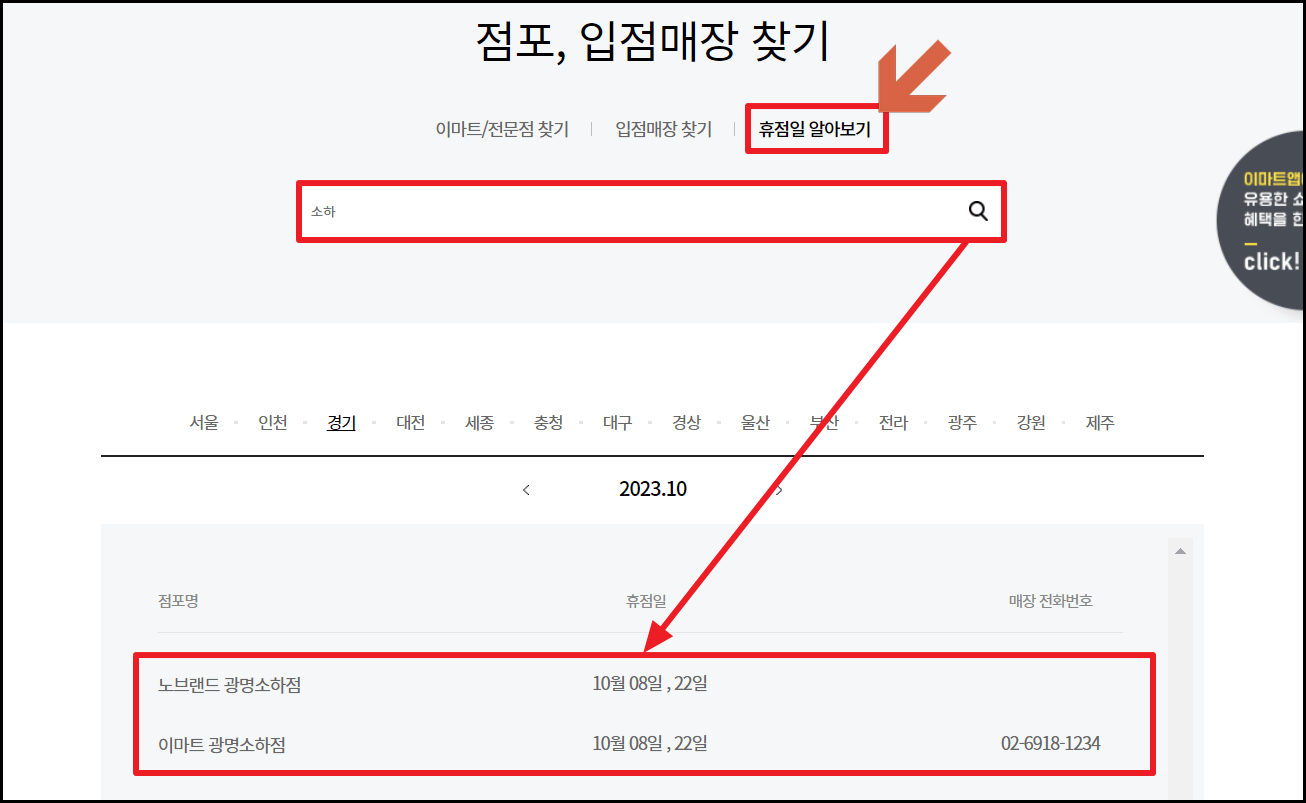 ② 저는 '소하'를 입력 후, 검색을 클릭하였습니다. 아래 보이는 것처럼 이마트와 노브랜드의 휴무일을 확인할 수 있습니다.