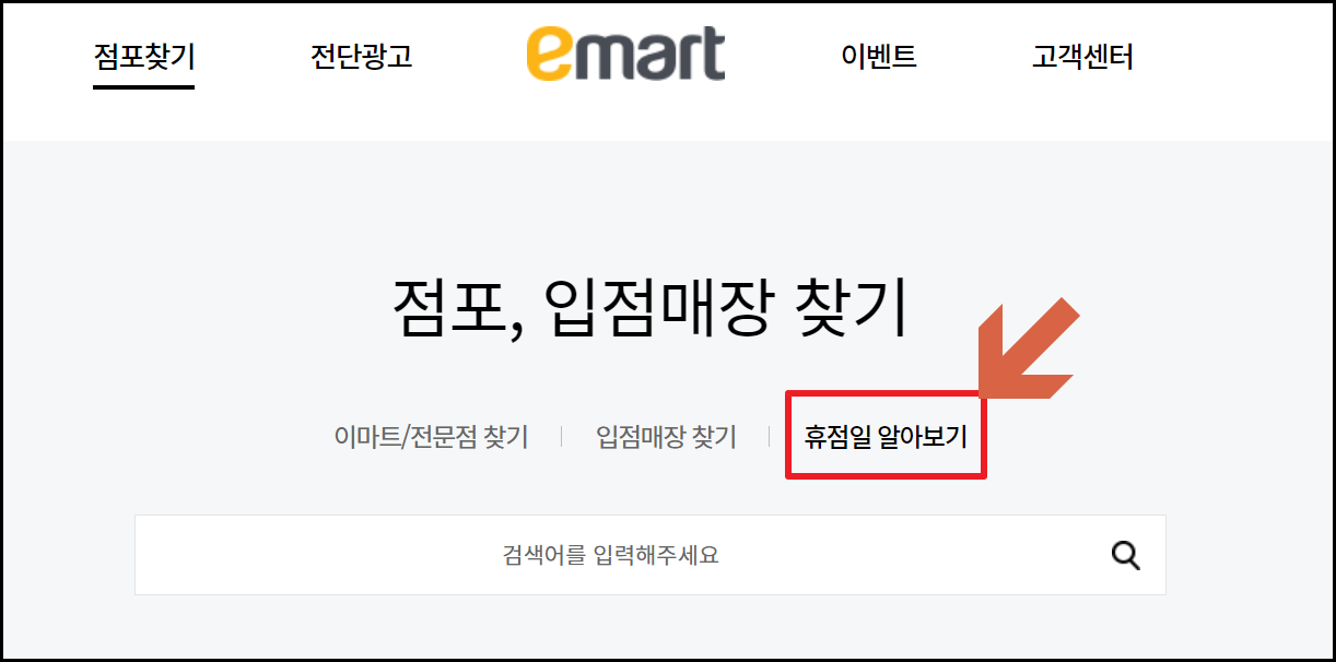 휴점일 알아보기 ▶ 확인하고자 하는 지점 입력 ▶ 돋보기 모양 클릭 ▶ 결과 확인